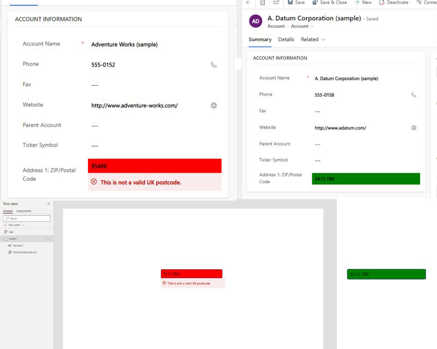 Example of the PCF control providing immediate visual feedback for invalid vs valid UK postcodes in model-driven and canvas apps.